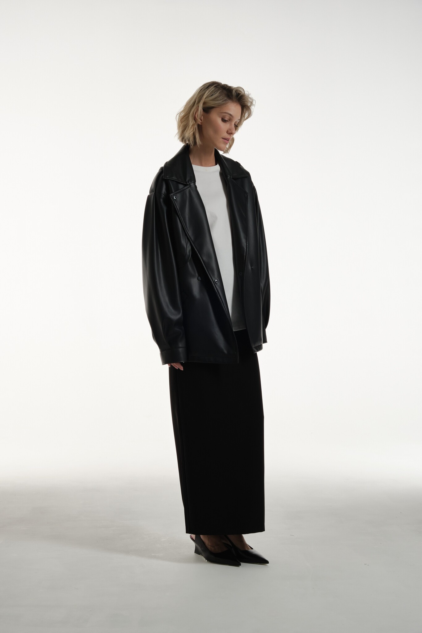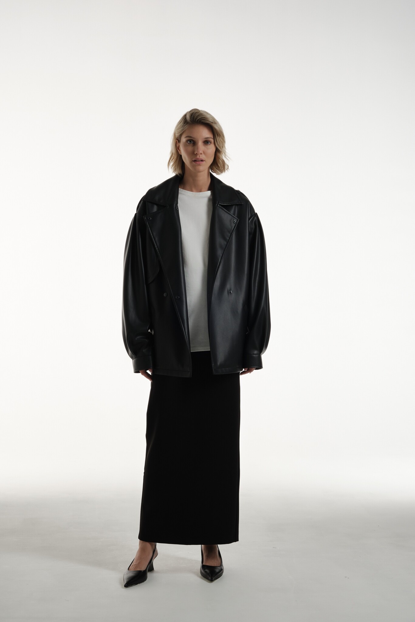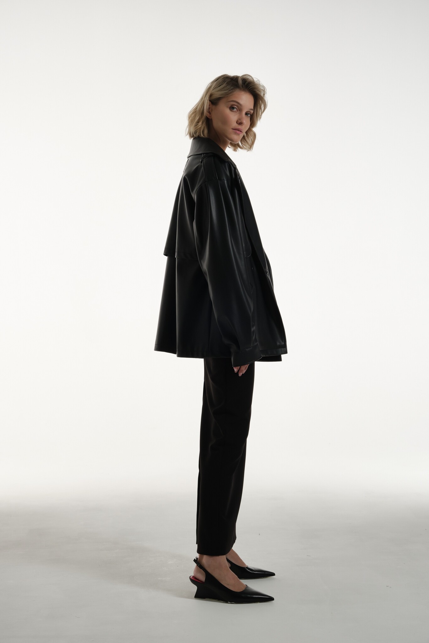 Куртка из мягкой эко-кожи, со спущенным плечом. Рукава объемные с заложенными складками и манжетом. Отлетная кокетка по спинке и спереди. Куртка фиксируется на кнопки, в комплекте есть пояс. На кокетке спинки есть фирманная нашивка из эко-кожи. Температурный режим до 0 градусов.